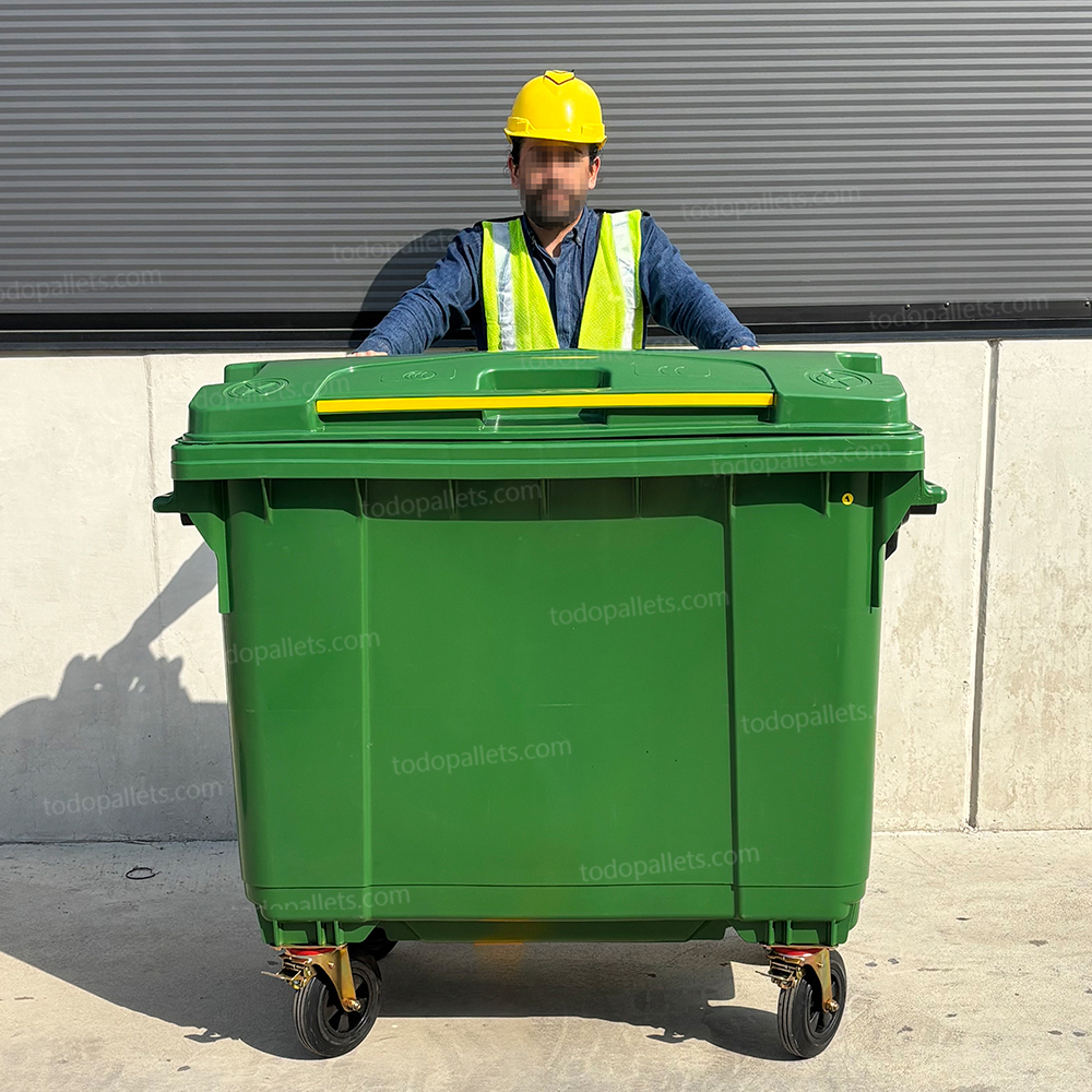 Contenedor de plástico de 1100 litros en color verde, fabricado en HDPE moldeado por inyección de alta presión. Cuenta con cuatro ruedas de caucho sólido, dos de las cuales están equipadas con frenos para un manejo seguro. Su estructura reforzada permite la recolección mecanizada, y su material resistente a cambios de temperatura y productos químicos asegura una durabilidad prolongada.