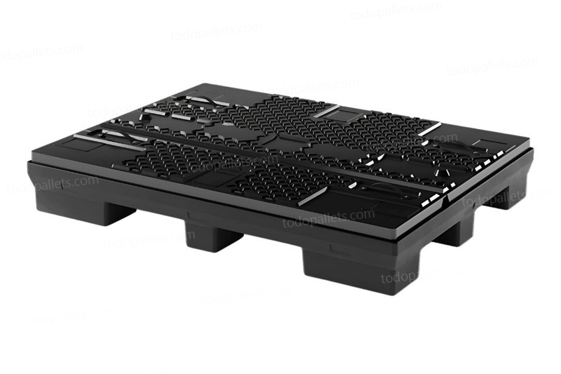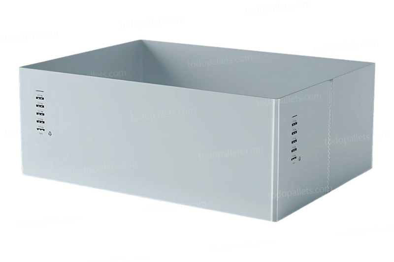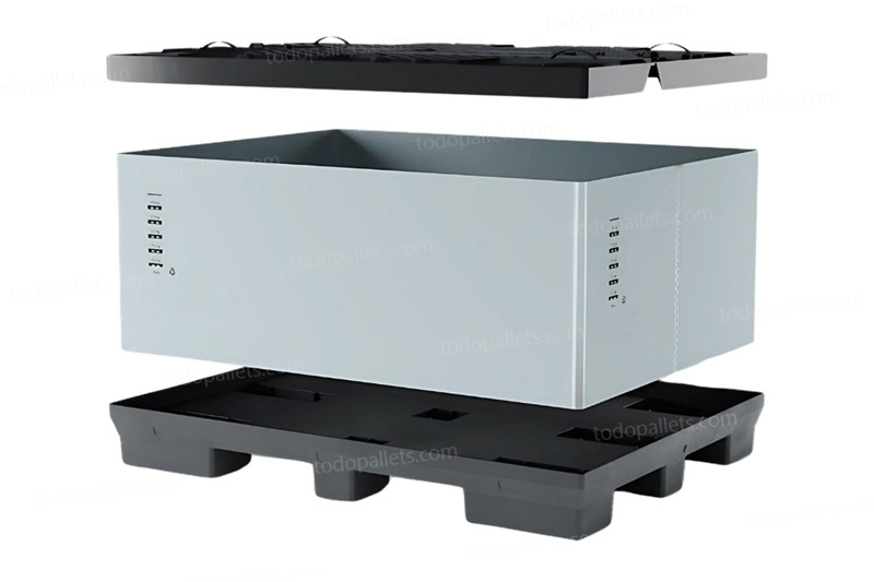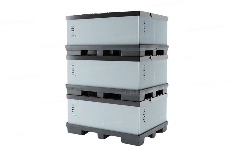 Contenedor plegable de 3 piezas (pallet, paredes y tapa), ideal para transporte de carga a granel. Fabricado por inyección, es resistente y fácil de manipular. Reduce su volumen hasta en un 80 %, optimizando el transporte de retorno y disminuyendo emisiones de CO₂. Su diseño permite un colapsado rápido en una sola unidad compacta.
