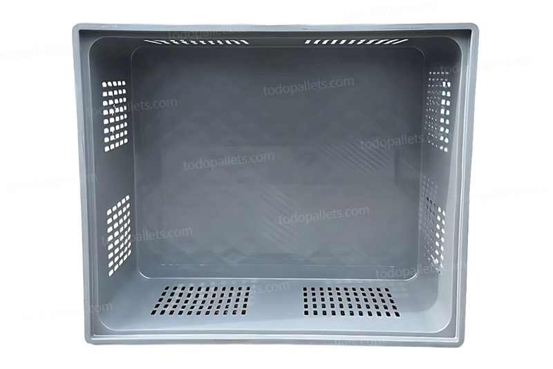 Su diseño con ranuras de ventilación permite una óptima circulación de aire, ideal para productos que requieren frescura y conservación como frutas, verduras, productos agrícolas o alimenticios en general. Además, cuenta con patines integrados y entrada por los 4 lados, facilitando el manejo con montacargas y patín hidráulico.
