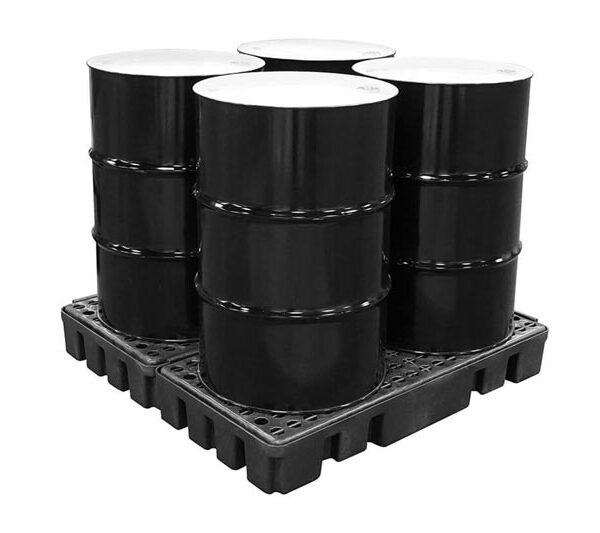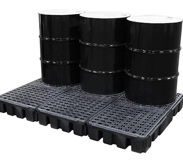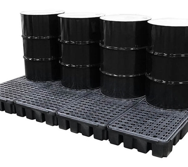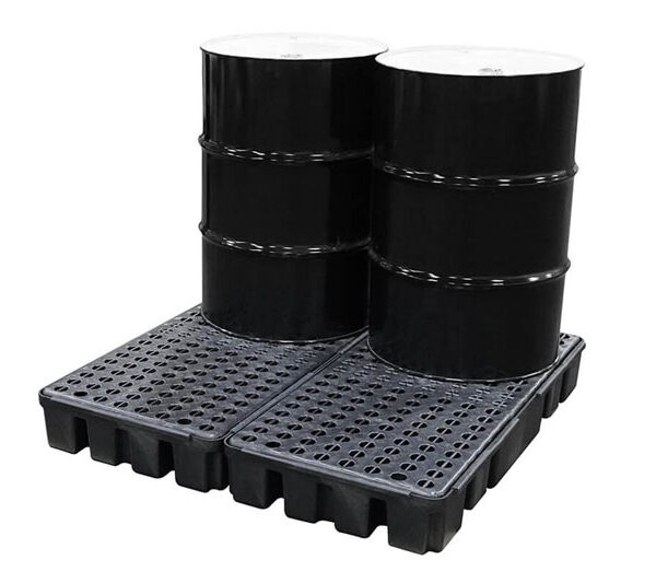 Gabinete de Seguridad para 4 Tambos Industriales resistente a químicos altamente corrosivos y a condiciones ambientales. Aprobado por Normas: EPA 40 CFR 264.175, SPCC, NPDES y UFC. Rejillas Removibles HDPE para su fácil limpieza, puertas corredizas con cerrojo de seguridad, entrada para montacargas.
